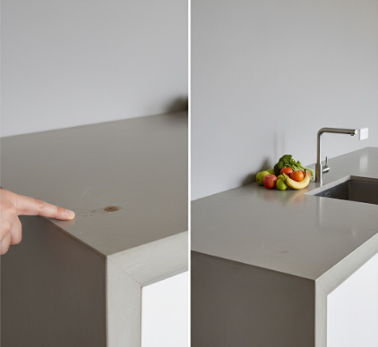 This is the most critical point to understand: concrete is naturally porous. Think of it as a very, very hard sponge. Without a sealer, any liquid—water, wine, oil, lemon juice, coffee—will soak right in and leave a stain. This means the performance of your countertop is almost entirely dependent on the quality and integrity of its sealer. There are many types of sealers, from simple penetrating sealers that just soak in, to heavy-duty topical sealers that form a plastic-like coating on top. The more robust and “stain-proof” the sealer, the more it can look and feel like a layer on top of the concrete, which some people feel detracts from the natural feel. Lighter, more natural-feeling sealers may require more caution. No matter what sealer is used, it will wear down over time and must be re-applied. This could be as often as every year or as infrequently as every 5 years, depending on the sealer and your kitchen’s usage. This is a maintenance task you simply don’t have with a non-porous material like quartz.